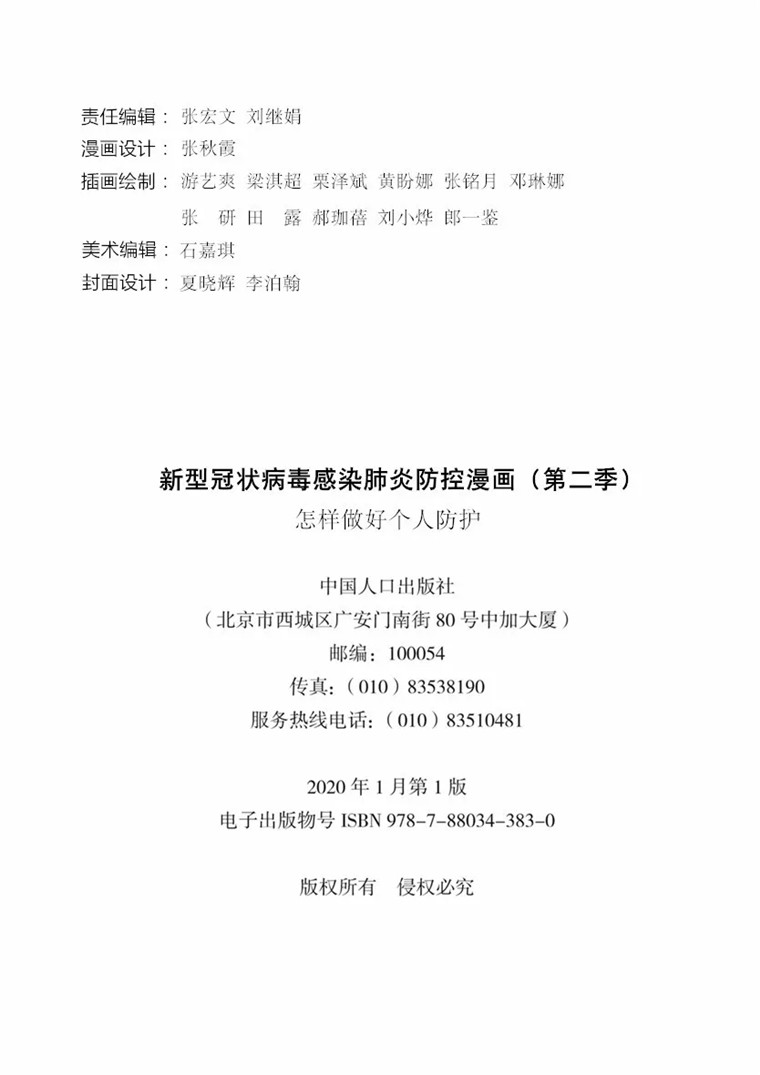 疫情就是命令,防控就是責(zé)任。為打贏新型冠狀病毒感染肺炎疫情防控阻擊戰(zhàn)、切實保障人民身體健康和生產(chǎn)生活秩序,遵照黨中央指示和國家衛(wèi)生健康委部署,中國人口出版社在健康科普專家委員會的指導(dǎo)下,聯(lián)合中華醫(yī)學(xué)著作網(wǎng)工作團隊編輯出版《新型冠狀病毒感染肺炎防控漫畫》。分5季推出:第一季,工作場所如何做好防護;第二季,怎樣做好個人防護;第三季,居家怎樣防護;第四季,新型冠狀病毒肺炎簡介;第五季,如何正確就醫(yī)及就醫(yī)注意事項。