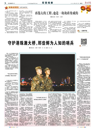 口岸巡邏的4名戰(zhàn)士來自一支榮譽連隊:武警廣東省總隊執(zhí)勤第二支隊執(zhí)勤一中隊。這個被國防部授予“紅色前哨連”稱號的中隊,還擔(dān)負著守衛(wèi)港珠澳大橋的重任。
