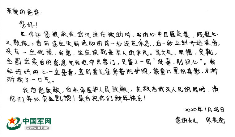 他們的女兒宋美倫,在父母執(zhí)行任務(wù)時(shí),住在姥姥家。由于爸爸平時(shí)比較繁忙,她與爸爸的交流并不太多。這段時(shí)間,她默默地每天都從網(wǎng)絡(luò)上查看武昌醫(yī)院的救治動(dòng)態(tài),盼望著能找到爸爸的身影。她還跟媽媽要了一張爸爸穿防護(hù)服的照片,自豪地分享給同學(xué)們,把爸爸稱作英雄。大年初四,媽媽在電話里告訴她,爸爸很忙,但一切都好。她想打電話不便,就提筆給爸爸手寫了一封信,拍了照,用微信發(fā)過去。信雖不長,卻在字里行間訴說著對爸爸的想念和敬佩,流淌著女兒的自豪和支持!