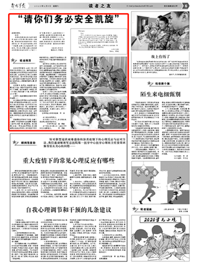 在得知您被派往武漢進(jìn)行救助時(shí),我的心中百感交集,既擔(dān)心又敬佩??吹侥谑盏酵ㄖ那耙幻脒€在休息,后一秒立刻開始準(zhǔn)備,沒有一絲猶豫,我想,這應(yīng)該就是軍人的作風(fēng)。軍大衣、軍帽、皮靴,全副武裝后的您急匆匆地沖出家門,只留了一句“沒事,別擔(dān)心”。我和媽媽的心一直懸著,直到看見您穿著防護(hù)服,戴著口罩的身影,才漸漸松了一口氣。