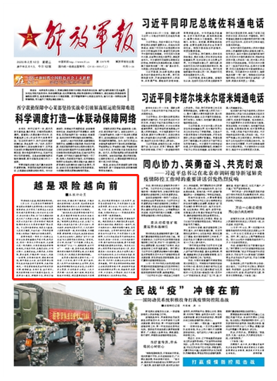 2月10日,習主席在北京調(diào)研指導新型冠狀病毒肺炎疫情防控工作并發(fā)表重要講話,充分肯定了疫情發(fā)生以來各條戰(zhàn)線為疫情防控工作付出的巨大努力、作出的重大貢獻,專門對支援湖北和武漢的廣大醫(yī)務工作者、人民解放軍指戰(zhàn)員以及各方面人員所體現(xiàn)的“越是艱險越向前的大無畏革命精神”提出表揚。習主席的重要講話,既是巨大激勵,又是有力鞭策,為我們進一步做好疫情防控工作提供了精神動力和根本指導。