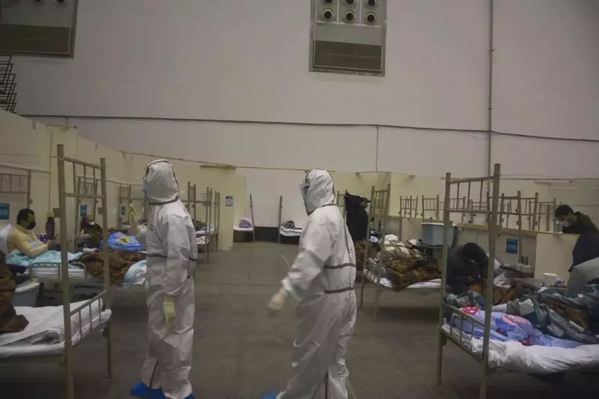 醫(yī)護(hù)人員陪同患者走入臨時(shí)病房