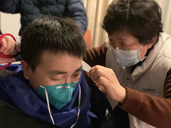 到達(dá)酒店,喬杰院長(zhǎng)早早等著迎接我們。當(dāng)天沈?qū)幐痹洪L(zhǎng)、袁曉寧副主任和葛慶崗隊(duì)長(zhǎng)第一時(shí)間召集大家,給我們講新冠肺炎的知識(shí),并進(jìn)行了防護(hù)培訓(xùn)。為了降低感染風(fēng)險(xiǎn),喬杰院長(zhǎng)和袁曉寧副主任還開了“院士理發(fā)室”,負(fù)責(zé)給大家剪頭發(fā)。金牌理發(fā)師“托尼·喬”和“托尼·袁的手藝”得到大家認(rèn)可,短暫的歡樂時(shí)光也讓大家緊張的心情放松了一些。