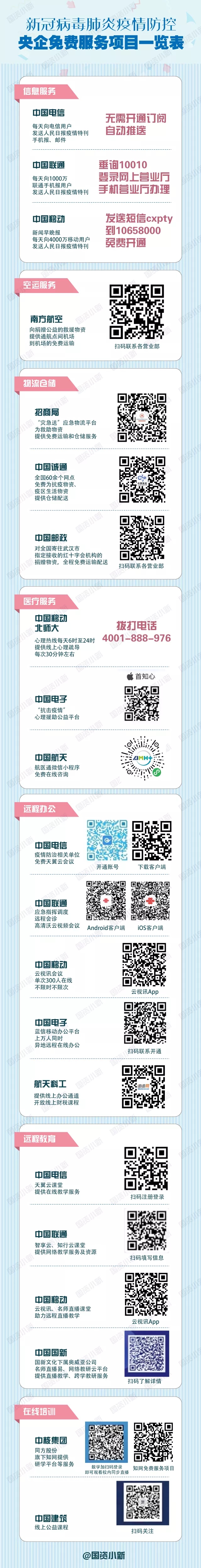 疫情防控期間,中央企業(yè)陸續(xù)推出了多項免費服務(wù),你用上了嗎?小新為你整理了一份超全的新冠肺炎疫情防控央企免費服務(wù)項目一覽表下面這張圖,存好,用起來!