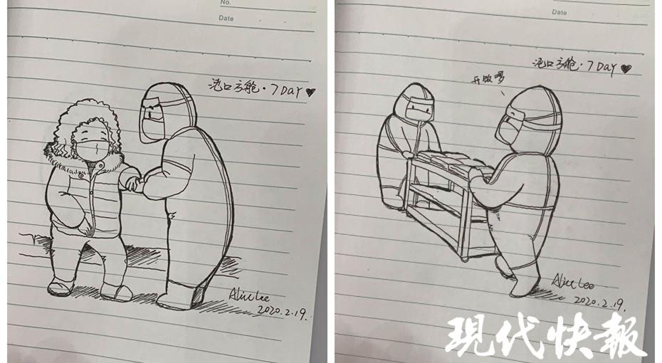 其實(shí),剛剛住進(jìn)方艙的時(shí)候,黎女士并沒(méi)有帶筆和本子,還是后來(lái)通過(guò)外賣(mài)購(gòu)買(mǎi)的。" 雖然他們每個(gè)人都穿著防護(hù)服,但是性格不一樣,做事方式也不一樣,我希望盡量能把他們的特點(diǎn)表現(xiàn)出來(lái)。醫(yī)護(hù)人員特別可愛(ài),今天還拿了一些白紙給我畫(huà)。"