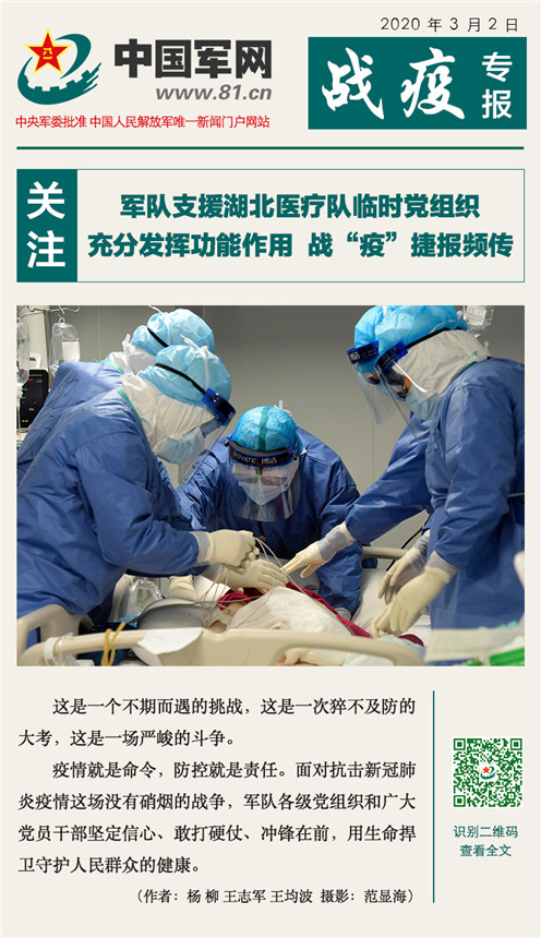 中國戰(zhàn)疫專報(bào)|軍隊(duì)支援湖北醫(yī)療隊(duì)臨時(shí)黨組織充分發(fā)揮功能作用 戰(zhàn)“疫”捷報(bào)頻傳