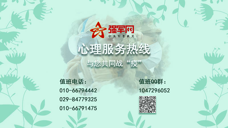 更多需要,歡迎使用強軍網(wǎng)應(yīng)對疫情心理服務(wù)熱線。值班QQ群:1047296052;電話:010-66794442、010-66791475、029-84779325。