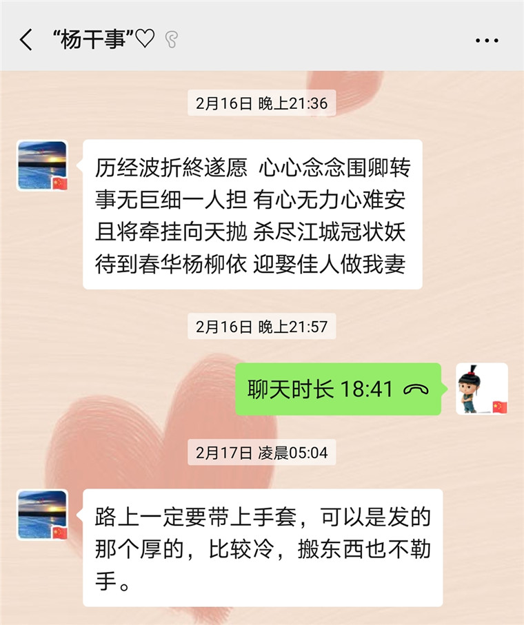 終于,2月13日,醫(yī)院再次受領支援任務。鄭潔二次請纓,如愿,可以攜手4名女隊員馳援武漢。離出發(fā)還有3天,鄭潔可以好好收拾收拾。但怎樣和家人開口呢?家人支持嗎?鄭潔不敢打電話,忐忑地編輯了一條信息,發(fā)到了家庭微信群。欣慰的是,一條條“支持”的回復給了她莫大的信心。未婚夫理解鄭潔的憂慮,發(fā)動一家人發(fā)來小視頻,并寫下送別詩為她加油打氣,“待到春華楊柳依,迎娶佳人做我妻?!备惺艿搅思胰说墓膭钆c溫暖,鄭潔心里的大石頭才終于放下。赴鄂!