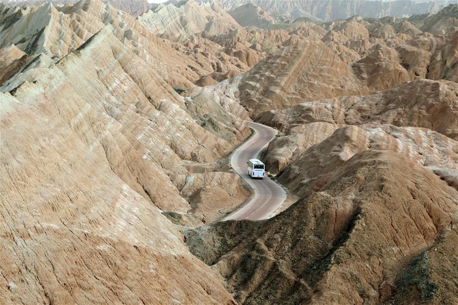 3月24日,一輛載有游客的景區(qū)巴士穿梭在張掖七彩丹霞景區(qū)。新華社發(fā)(張智敏 攝)