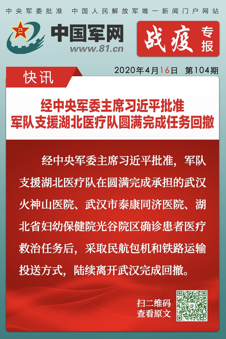 中國(guó)軍網(wǎng)戰(zhàn)疫專報(bào)|經(jīng)中央軍委主席習(xí)近平批準(zhǔn) 軍隊(duì)支援湖北醫(yī)療隊(duì)圓滿完成任務(wù)回撤