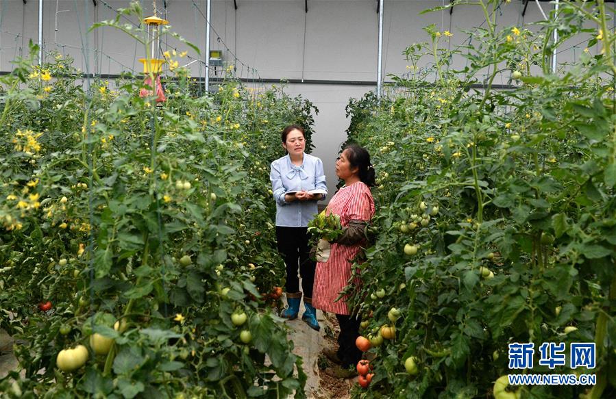 王萌萌(左)在安徽滁州西孔村產(chǎn)業(yè)扶貧基地向農(nóng)戶收集建議(5月8日攝)。新華社發(fā)(黃博涵 攝)