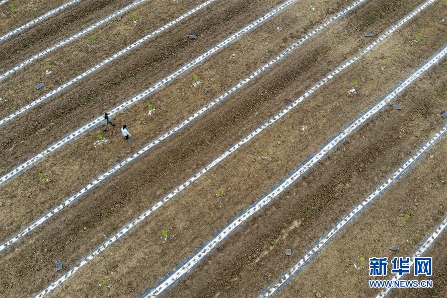王萌萌(右)在安徽滁州西孔村山核桃基地調(diào)研(5月8日攝,無人機照片)。新華社發(fā)(黃博涵 攝)