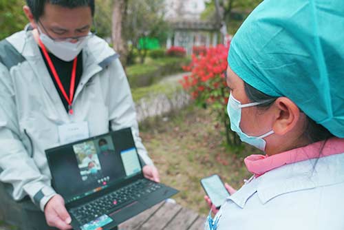 圖為如克亞木·麥提賽地和武漢市第七醫(yī)院醫(yī)務(wù)人員視頻連線。 韓基琛 攝