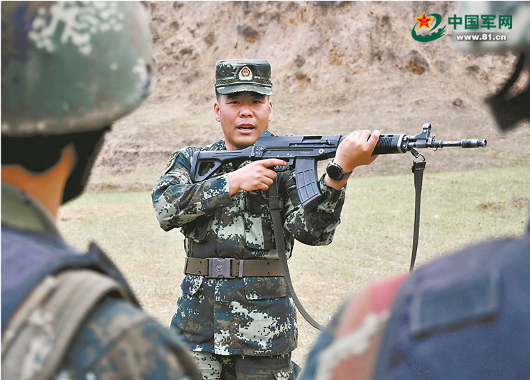 雁門關(guān)外微寒,夜雨漸迷人眼。褚旭亮一手托槍,一手指向靶標(biāo),向身后士官骨干講解示范哨兵執(zhí)勤射擊技巧。
