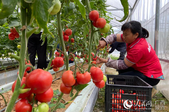 在環(huán)江縣川山鎮(zhèn)塘萬(wàn)村大棚果蔬種植基地,村民忙著采摘西紅柿。羅惜翎攝