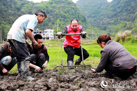 環(huán)江縣明倫鎮(zhèn)龍水村第一書(shū)記韋振乾帶領(lǐng)群眾采挖馬蹄。韋貺攝