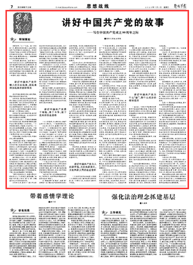 當(dāng)前,國(guó)際競(jìng)爭(zhēng)日趨復(fù)雜,輿論斗爭(zhēng)越發(fā)激烈,我們要講出中國(guó)共產(chǎn)黨為人民、為民族、為世界做出的卓著成績(jī),更要講出中國(guó)共產(chǎn)黨為人民謀幸福、為民族謀復(fù)興、為世界謀大同的真摯情懷。這種情懷,激勵(lì)著我們黨一往無前、奮勇前進(jìn);這種情懷,必將使我們黨永葆青春、永不懈怠。
