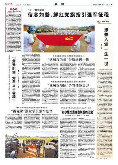 思想入黨好比萬里長征,一步接一步,一步跟不上就會(huì)掉隊(duì)。廣大官兵特別是黨員干部要經(jīng)常進(jìn)行思想政治體檢,與黨中央要求“對(duì)表”,拿黨章黨規(guī)“掃描”,用人民群眾期待“透視”,同先輩先烈、先進(jìn)典型“對(duì)照”,自覺做到在黨言黨、在黨憂黨、在黨為黨。無論是黨員意識(shí)的強(qiáng)化、黨性修養(yǎng)的提升,還是錘煉初心、體悟使命,都離不開嚴(yán)肅認(rèn)真的黨內(nèi)政治生活錘煉。各級(jí)黨組織應(yīng)燒旺黨內(nèi)政治生活的爐火,讓黨的肌體每一個(gè)細(xì)胞都健康無恙、煥發(fā)活力,讓廣大黨員干部努力在強(qiáng)軍興軍的征程上用汗水澆灌收獲,以實(shí)干篤定前行。