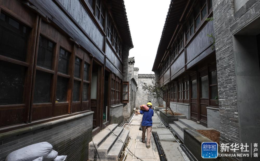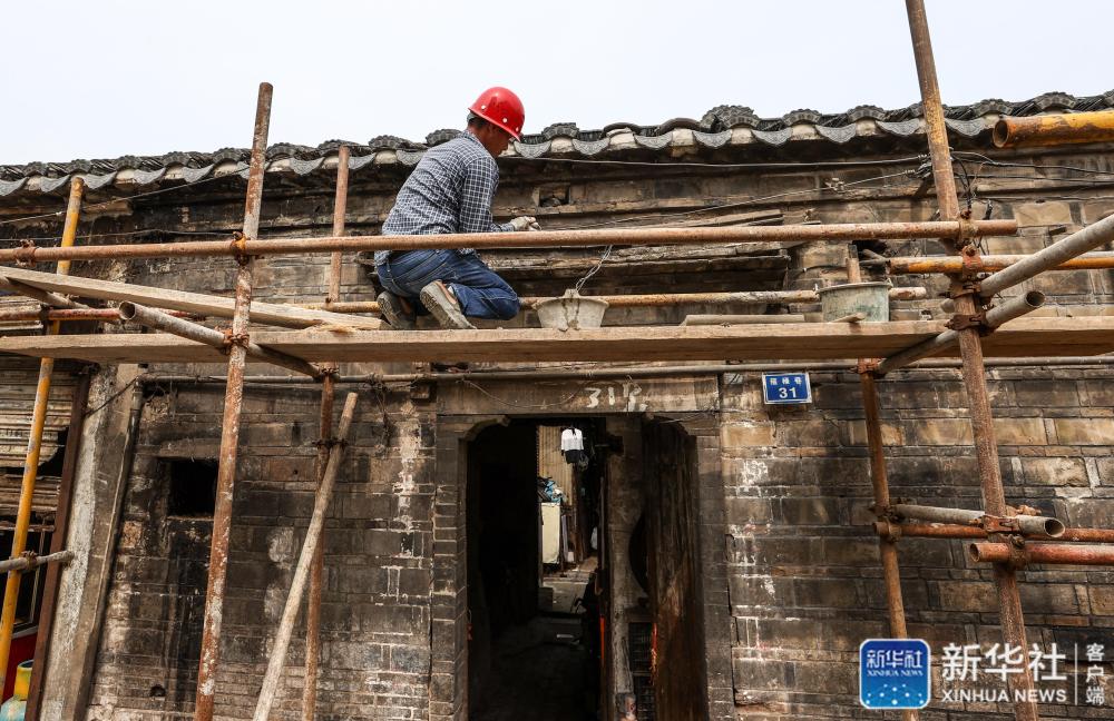 在南京小西湖片區(qū),一名建筑工人在維修老宅的大門(7月1日攝)。新華社記者 楊磊 攝