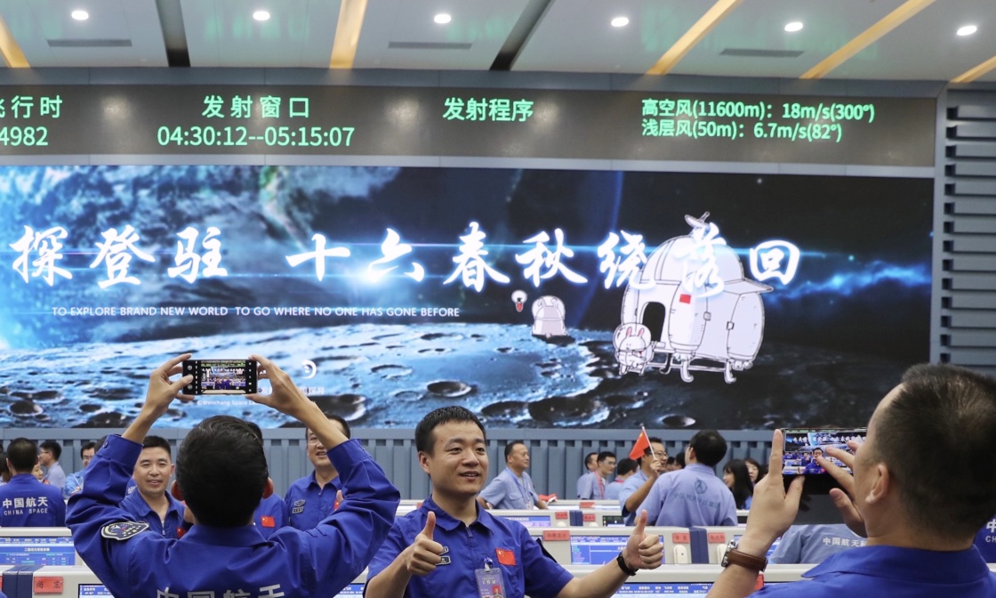 11月24日4時30分,我國在中國文昌航天發(fā)射場,用長征五號遙五運載火箭成功發(fā)射探月工程嫦娥五號探測器,火箭飛行約2200秒后,順利將探測器送入預(yù)定軌道,開啟我國首次地外天體采樣返回之旅。這是航天科技人員在文昌航天發(fā)射場慶祝發(fā)射成功。