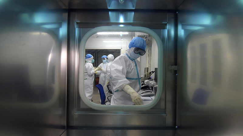 記者透過(guò)傳遞窗口拍攝到醫(yī)療隊(duì)隊(duì)員在武漢火神山醫(yī)院隔離病區(qū)緊張有序開(kāi)展工作。