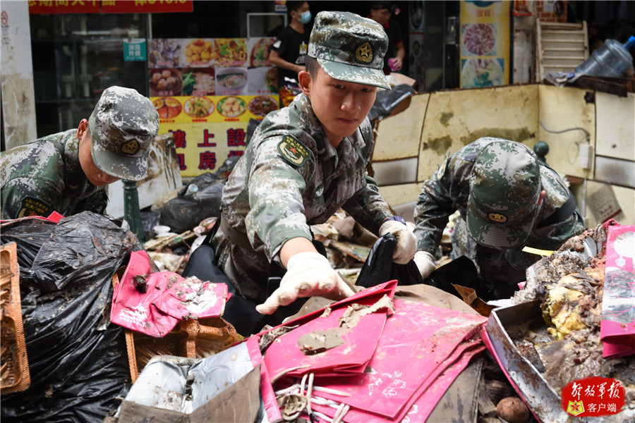 在超強(qiáng)臺(tái)風(fēng)“天鴿”襲擊澳門后開(kāi)展的救災(zāi)行動(dòng)中,駐澳門部隊(duì)官兵清理街區(qū)垃圾。