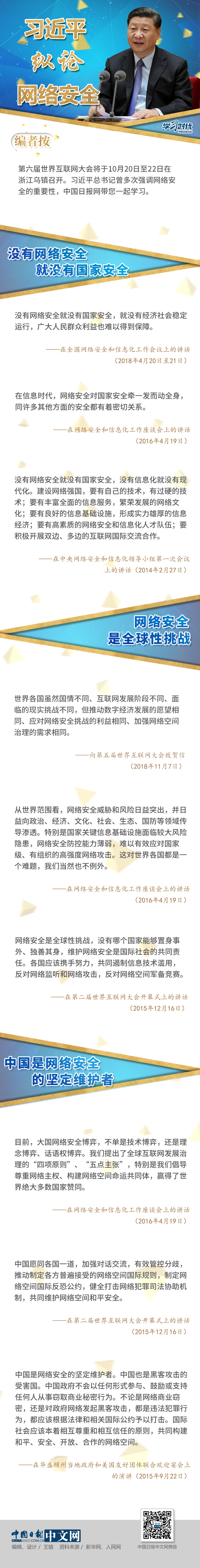 編者按:第六屆世界互聯(lián)網(wǎng)大會(huì)于2019年10月20日至22日在浙江烏鎮(zhèn)召開。習(xí)近平總書記曾多次強(qiáng)調(diào)網(wǎng)絡(luò)安全的重要性,中國日報(bào)網(wǎng)帶您一起學(xué)習(xí)。