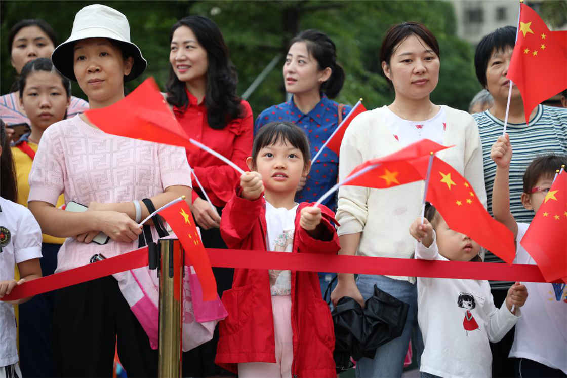 現(xiàn)場觀眾揮舞國旗為祖國喝彩。