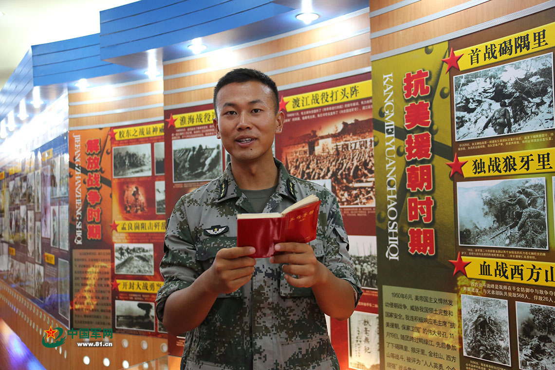 “強(qiáng)軍精武紅四連”指導(dǎo)員陳思宇在連史館講述紅色日記本的故事。中國軍網(wǎng)記者孫智英 攝