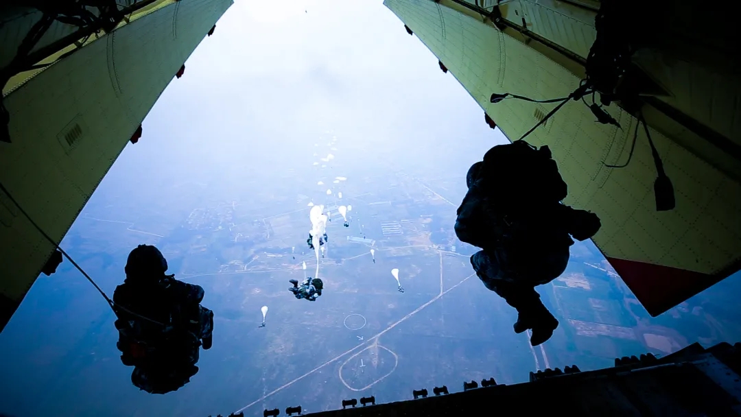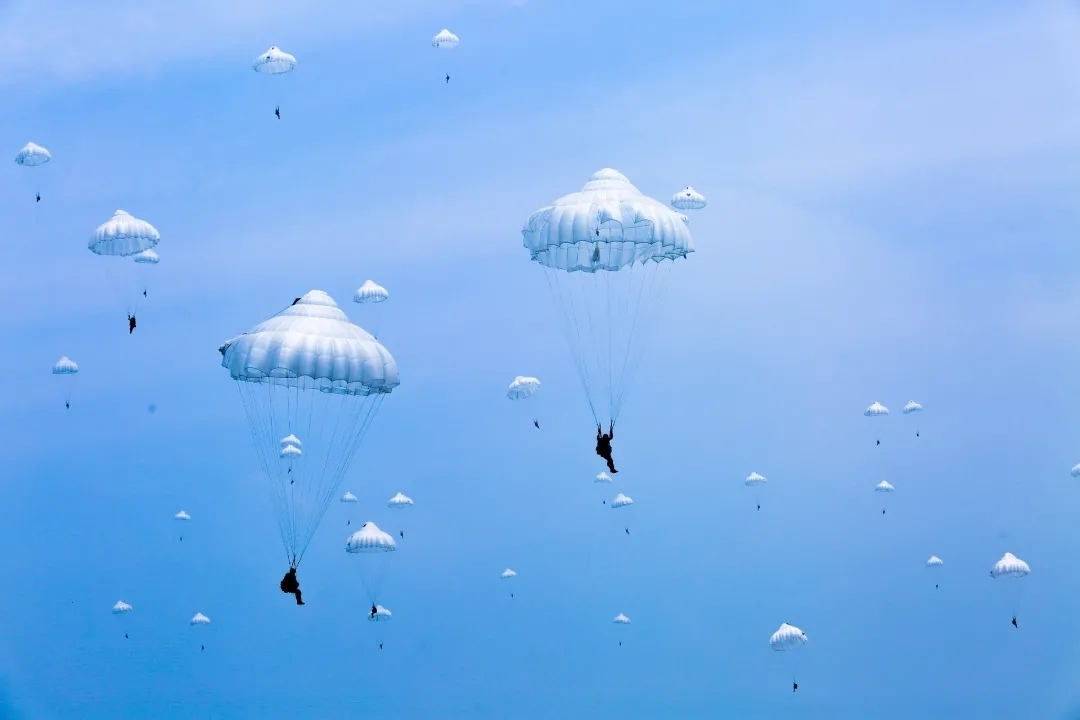 “跳!”綠燈亮,傘訓(xùn)教練的指令穿透風(fēng)聲和飛機(jī)轟鳴聲傳來,余海龍應(yīng)聲一躍,第一個(gè)跳出了機(jī)艙。其余官兵緊隨其后,一朵朵傘花在藍(lán)天綻放。