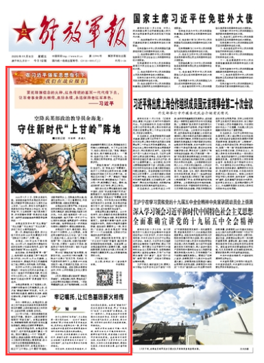 2020年9月17日,空降兵某部禮堂。該部政治教導(dǎo)員余海龍?jiān)趹c祝中國人民解放軍空降兵成立70周年大會(huì)上發(fā)言:“2014年,我作為空軍基層代表參加古田全軍政治工作會(huì)議,吃‘紅軍飯’時(shí),習(xí)主席把第一筷子菜夾給了我,并當(dāng)面囑咐我要‘傳承好紅色基因’,統(tǒng)帥的諄諄教誨始終激勵(lì)我奮勇向前……”