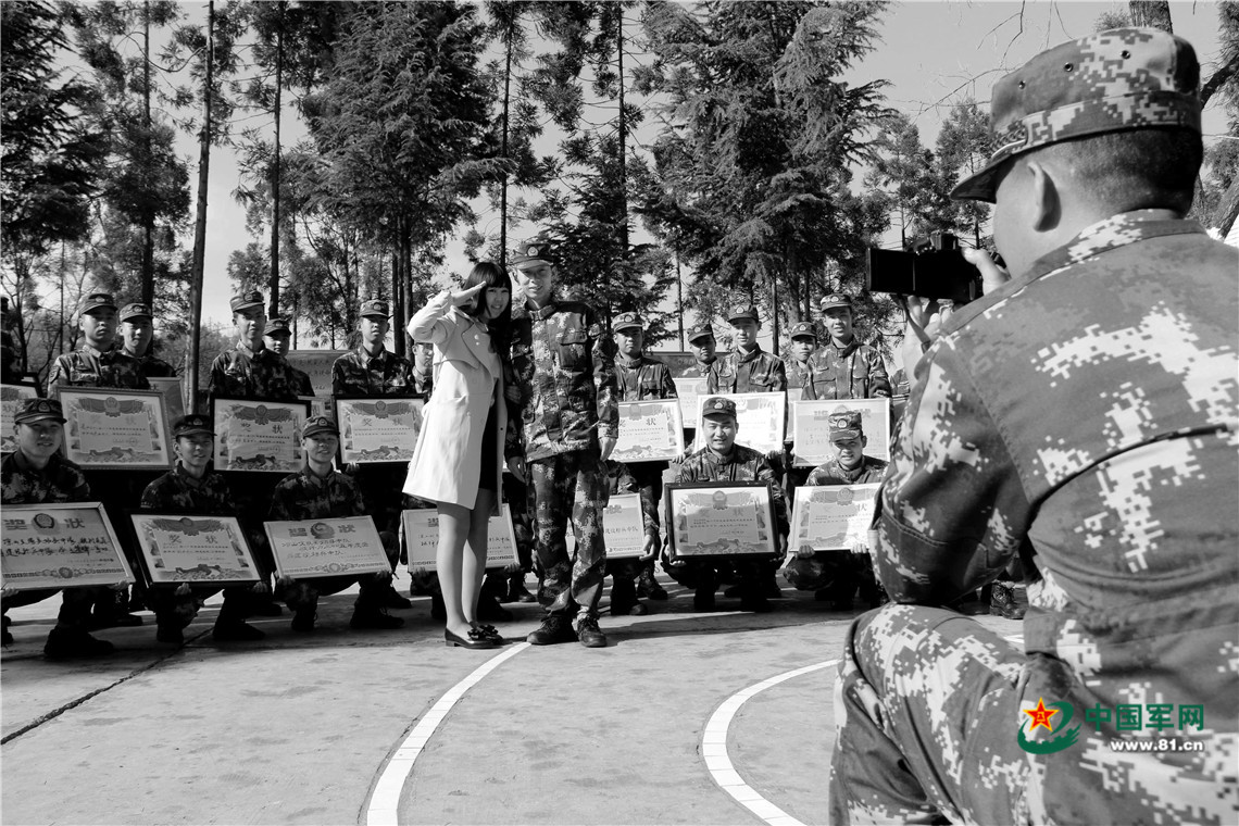 2017年4月,戰(zhàn)友布哈給第一次來(lái)中隊(duì)探親的軍嫂陳云和丈夫鄭坤在榮譽(yù)匾牌前拍合影照。?