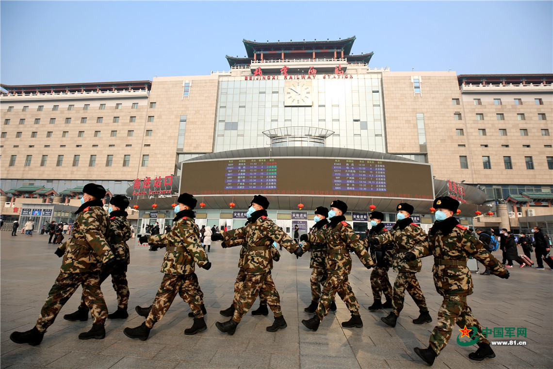 2020年春節(jié)期間,守衛(wèi)北京西站的武警官兵在做好防護(hù)措施的同時(shí),繼續(xù)堅(jiān)守在執(zhí)勤崗位上。
