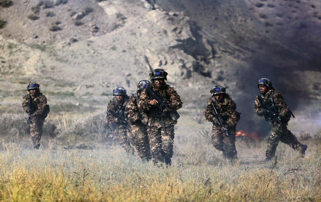 在實兵對抗演練中,新疆軍區(qū)某紅軍師“藍軍”分隊發(fā)起反攻(2019年9月4日攝)。新華社發(fā)(劉永 攝)