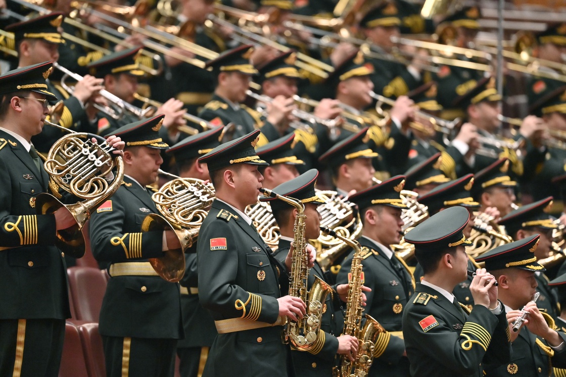 3月4日,中國人民政治協(xié)商會議第十三屆全國委員會第四次會議在北京人民大會堂開幕。這是軍樂團在演奏。