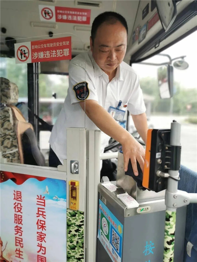 退役軍人丁向華將駕駛的公交車打造成了軍營主題車廂。整體車廂以綠色迷彩基調(diào)為主,在駕駛室正前方張貼了“ 退役軍人為您服務”的字樣,讓市民充分感受到退役軍人就在身邊。