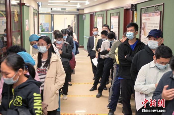 資料圖:接種區(qū)外,市民排隊等待接種疫苗。 俞靖 攝