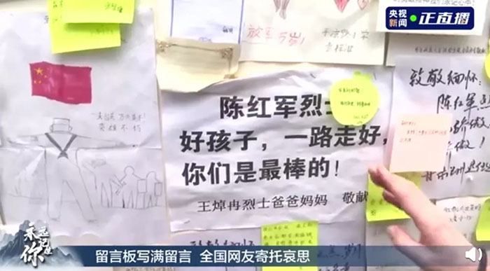 陳紅軍烈士墓旁有兩條特別的留言。一條來自衛(wèi)國戍邊犧牲烈士王焯冉的父母,寫著“好孩子,一路走好,你們是最棒的!”。另一條,來自四川木里火災(zāi)犧牲烈士王佛軍的父母,“你們的勇敢精神我們永記心中”……