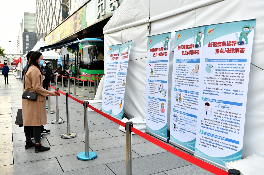 4月7日,在北京西單商業(yè)區(qū),行人駐足觀看接種點(diǎn)展示的新冠疫苗接種知識(shí)宣傳海報(bào)。