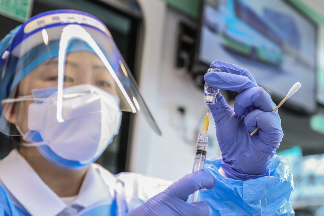4月7日,醫(yī)護(hù)人員在移動疫苗接種車上進(jìn)行接種準(zhǔn)備工作。