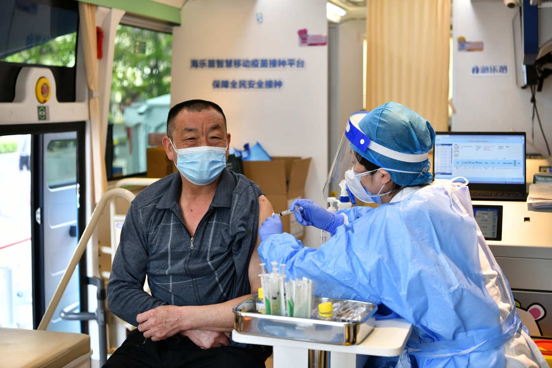 4月7日,市民在移動疫苗接種車上接種新冠疫苗。