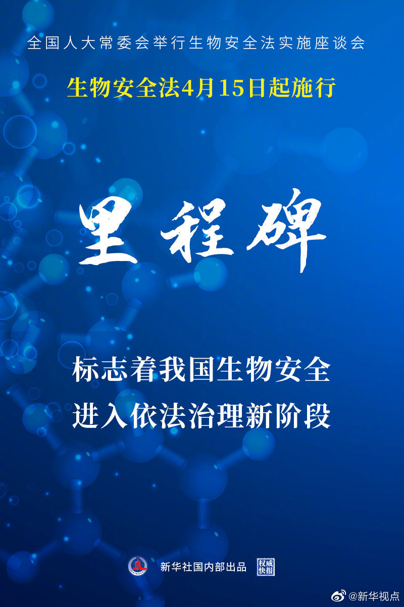 全國(guó)人大常委會(huì)4月1日舉行生物安全法實(shí)施座談會(huì)。會(huì)議指出,要堅(jiān)持總體國(guó)家安全觀,從統(tǒng)籌發(fā)展和安全的戰(zhàn)略高度,全面有效實(shí)施生物安全法。生物安全法將自2021年4月15日起施行。它的頒布和實(shí)施起到一個(gè)里程碑的作用,標(biāo)志著我國(guó)生物安全進(jìn)入依法治理的新階段。(記者陳菲)