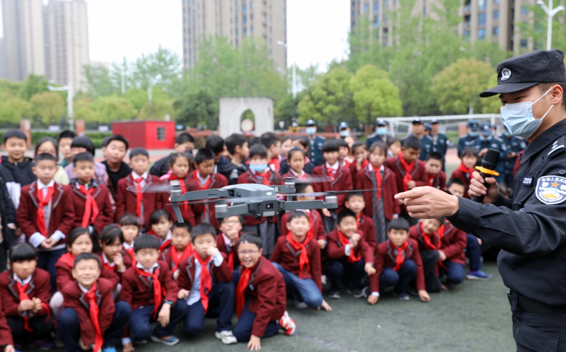 4月14日,合肥市公安局特巡警支隊(duì)一大隊(duì)的警官給學(xué)生們介紹無(wú)人機(jī)在警務(wù)安全中的應(yīng)用。新華社記者 曹力 攝