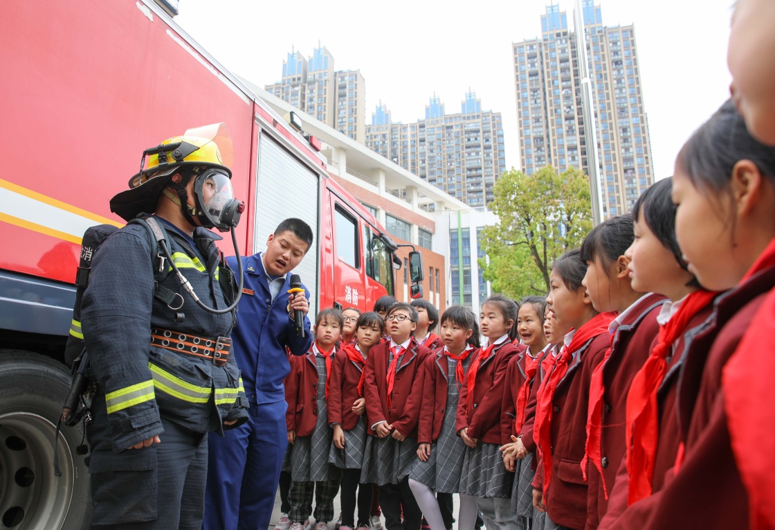 4月14日,合肥市消防救援支隊(duì)塘西河消防救援站的消防工作人員向?qū)W生們介紹消防安全知識(shí)。新華社記者 曹力 攝