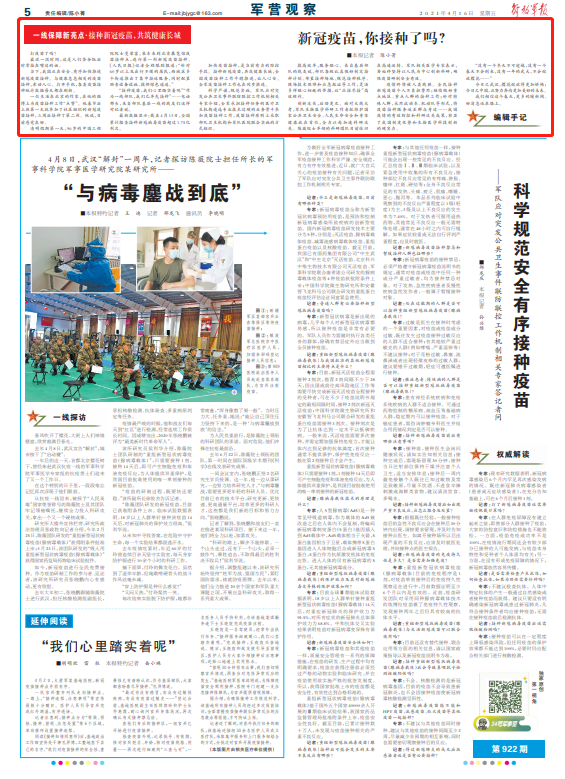 加快疫苗接種,是當(dāng)前有力的防控手段。接種新冠疫苗,共筑健康長(zhǎng)城,全國(guó)疫苗接種工作平穩(wěn)推進(jìn),讓人心安。全軍疫苗接種工作也在同步推進(jìn)。