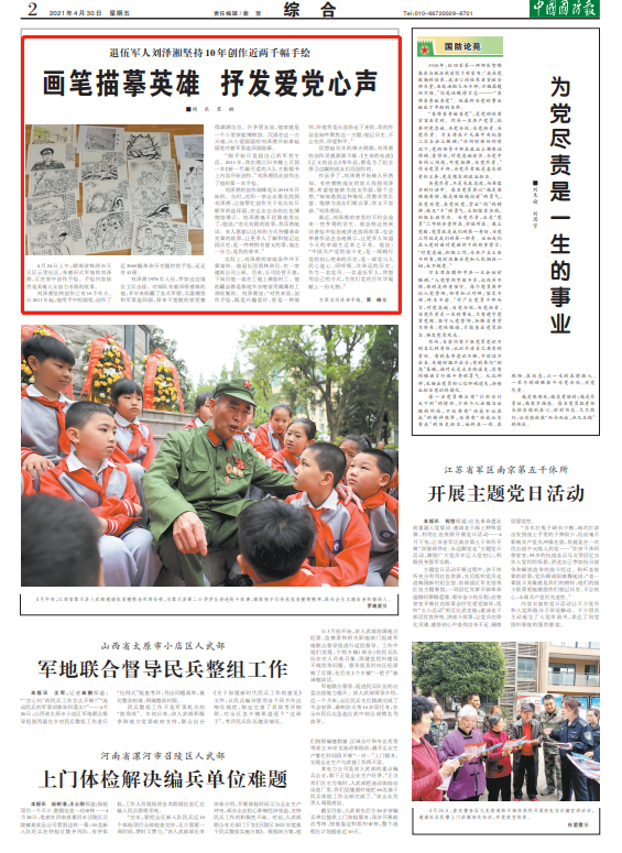 最近,劉澤湘的家里時(shí)不時(shí)會(huì)迎來一些參觀的學(xué)生。他會(huì)給這些來訪者繪聲繪色地講述戰(zhàn)場(chǎng)故事,也會(huì)帶著作品去各地展示,讓更多人知道今天的幸福生活來之不易。他說:“中國(guó)共產(chǎn)黨的奮斗史,是一部踐行黨的初心使命的歷史,是一部黨與人民心連心、同呼吸、共命運(yùn)的歷史。作為一名黨員、一名退伍軍人,我想用自己的方式,為我們黨的百年華誕獻(xiàn)上一份禮物。”