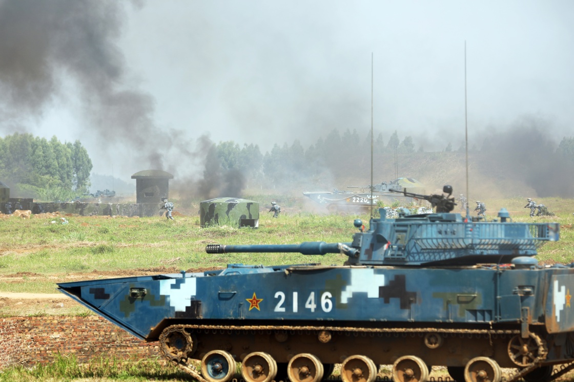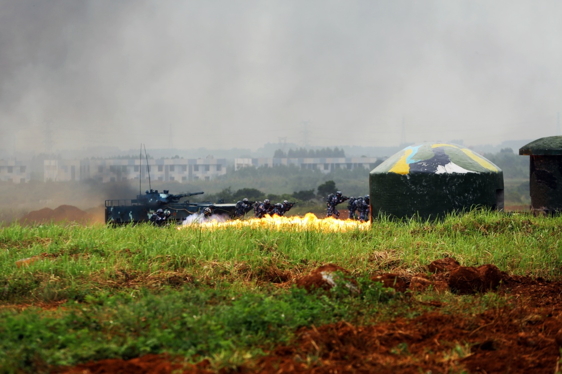 槍聲大作間,自天而降的機(jī)降分隊(duì),在兩棲戰(zhàn)車掩護(hù)下,向著藍(lán)軍陣地不斷發(fā)起猛烈攻勢(shì)。此時(shí),藍(lán)軍正面防御工事已被摧毀,承擔(dān)突擊任務(wù)的步兵分隊(duì)以摧枯拉朽之勢(shì)向縱深挺進(jìn)……