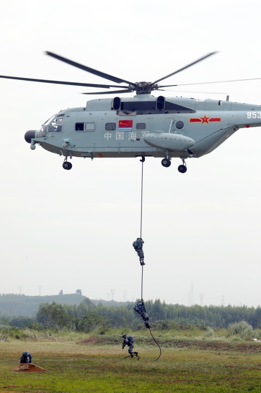 演練中,海軍陸戰(zhàn)隊(duì)某旅機(jī)降分隊(duì)隊(duì)員從直升機(jī)上滑降登陸(2020年10月12日攝)。新華社發(fā)(姚冠辰 攝)