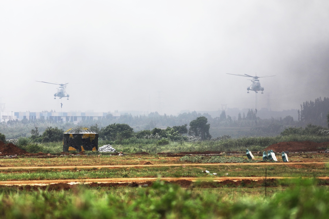 演練中,海軍陸戰(zhàn)隊(duì)某旅機(jī)降分隊(duì)飛抵至目標(biāo)區(qū)域(2020年10月13日攝)。新華社發(fā)(劉宇翔 攝)