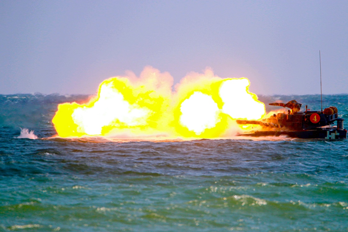實(shí)彈射擊訓(xùn)練中,海軍陸戰(zhàn)隊(duì)某旅兩棲裝甲車進(jìn)行海上浮渡射擊 (5月18日攝)。新華社發(fā)(劉宇翔 攝)